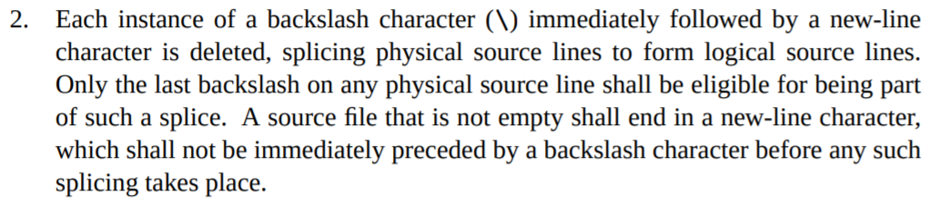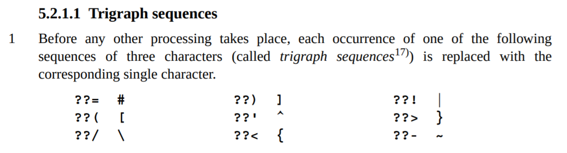 At a glance, these sound effectively identical. Neither language allows nesting /*, and // continues “the end of the line” or “the next new-line character,” which sound the same in any circumstance I can imagine. I briefly considered investigating if the languages perhaps differed on the definition of “new-line character” (\r, anyone?) but decided to shelve that for now in favor of looking at other transformations that might happen even before comment processing. If we can cause the lexers to see different character streams, we might be able to win. That lead me to … trigraphs!