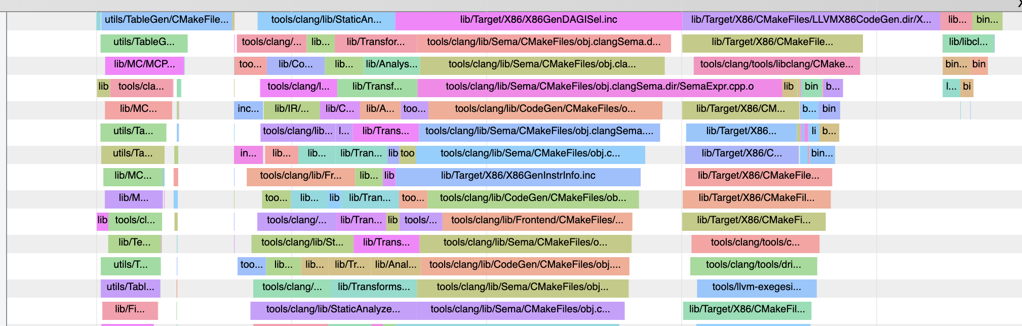 We can also see from the above trace that a few files take disproportionately long to compile. For instance, llvm/lib/Target/X86/X86ISelLowering.cpp is extremely slow. That file turns out to contain 50,000(!) lines of C++ source, constituting 2MB (!!) of text. I suspect that splitting the largest ~5 files into smaller compilation units, so that they are no longer holding up the parallel build, might also be a substantial win.